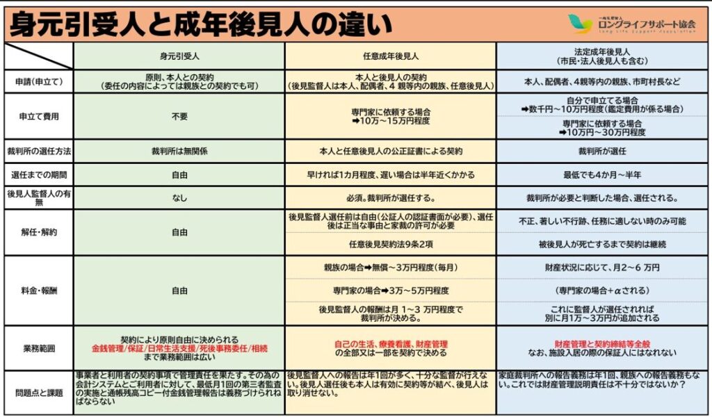 成年後見人制度と身元引受制度のKFS(成功要因)は根本から異なります。両者に共通して異なる最大の要因は金銭管理と考えます。成年後見人は財産管理の報告義務は年1回裁判所に対して行う義務を負いますが、我々身元引受人の財産管理は最低月1回の本人又は利害関係者への報告が義務付けられねばなりません。お金を預かることの管理責任は定期的な報告義務(アカウンタビリティ)が伴います。