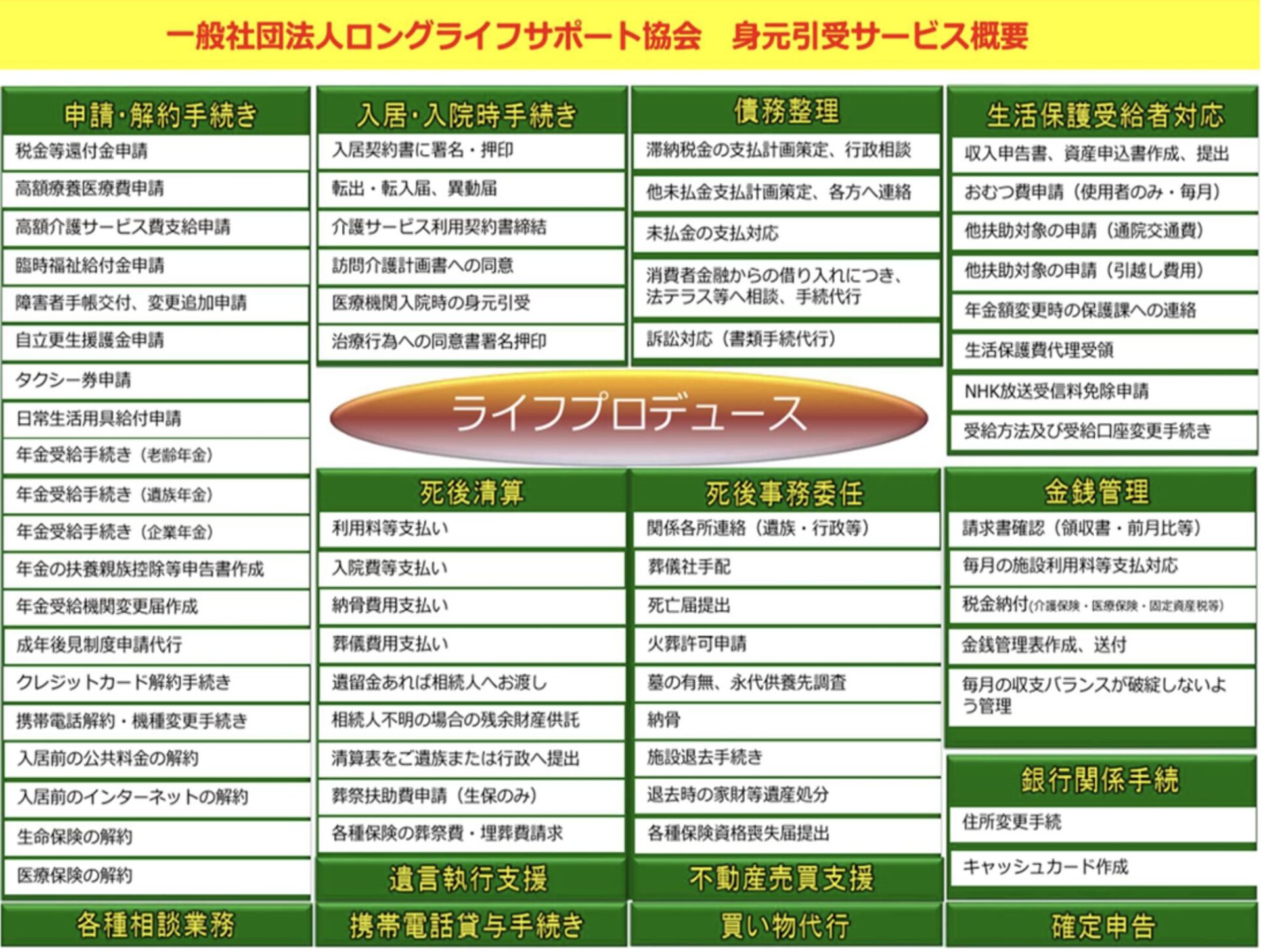 私たち一般社団法人ロングライフサポート協会は、介護に起源を持つ法人として、身寄りのない高齢者やご家族の負担を軽減するために、暮らし全体を支える「身元引受サービス」を行っています。